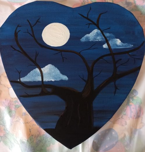 Bedenk wat voor afbeelding je op het doek wil weergeven. Ben je op zoek naar inspiratie neem dan een kijkje op Pinterest. Voor dit ontwerp heb ik gekozen voor een boom in een donkere nacht. Tijdens het schilderen werk ik van achter naar voren. Begin daarom met het schilderen van je achtergrond.