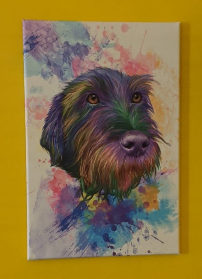 Ik denk dat ik mijn zus nog nooit zo enthousiast heb gezien over een cadeau. Ze vond het fantastisch om haar hondje zo te zien schitteren. Meteen werd gezocht naar de perfecte plek om hem op te hangen. Dit is een prominente plek in de woonkamer geworden, waar het iedere dag kleur geeft.