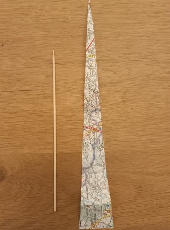 Nu de vleugels af zijn is het tijd voor het lichaam. Hiervoor heb je een satéprikker nodig en een stukje van de kaart (van 4 bij 30 cm) wat uitloopt in de punt. Rol het stukje kaart om de satéprikker en lijm het uiteinde vast, zodat dit opgerold blijft. Zorg ervoor dat het lichaam niet vast wordt geplakt aan de satéprikker.